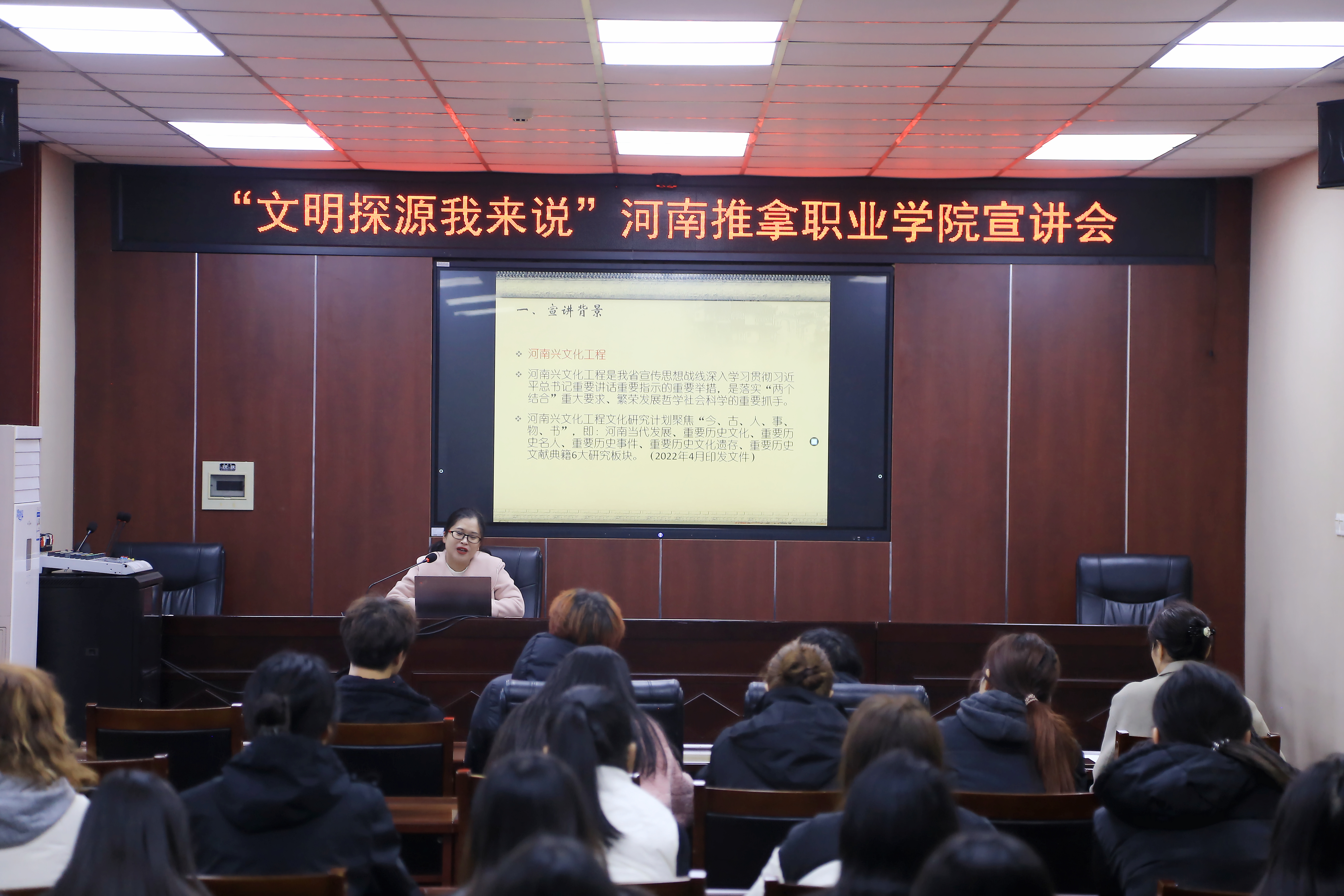 11月16日下午,学院在二楼视频会议室举行了“文明探源我来说”主题讲座。本次讲座特邀河南省社会科学院文学研究所陈亚玲老师主讲,教职工代表及50余名学生参加。 陈亚玲老师以“打造华夏古都品牌 讲好黄河故事”为题,...