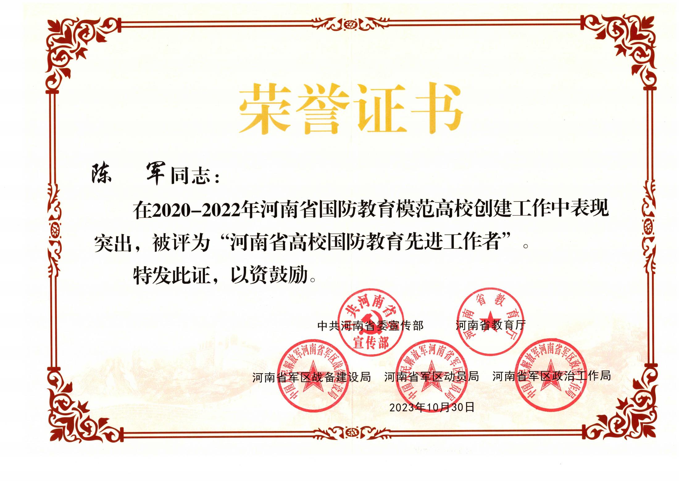 近日,在河南省国防教育模范高校创建工作评比中,我院武装部陈军同志获评“2020-2022年河南省高校国防教育先进工作者”荣誉称号,思想政治课教学部军事理论课教师张又丹获评“2020-2022年河南省高校国防教育优秀教师”...