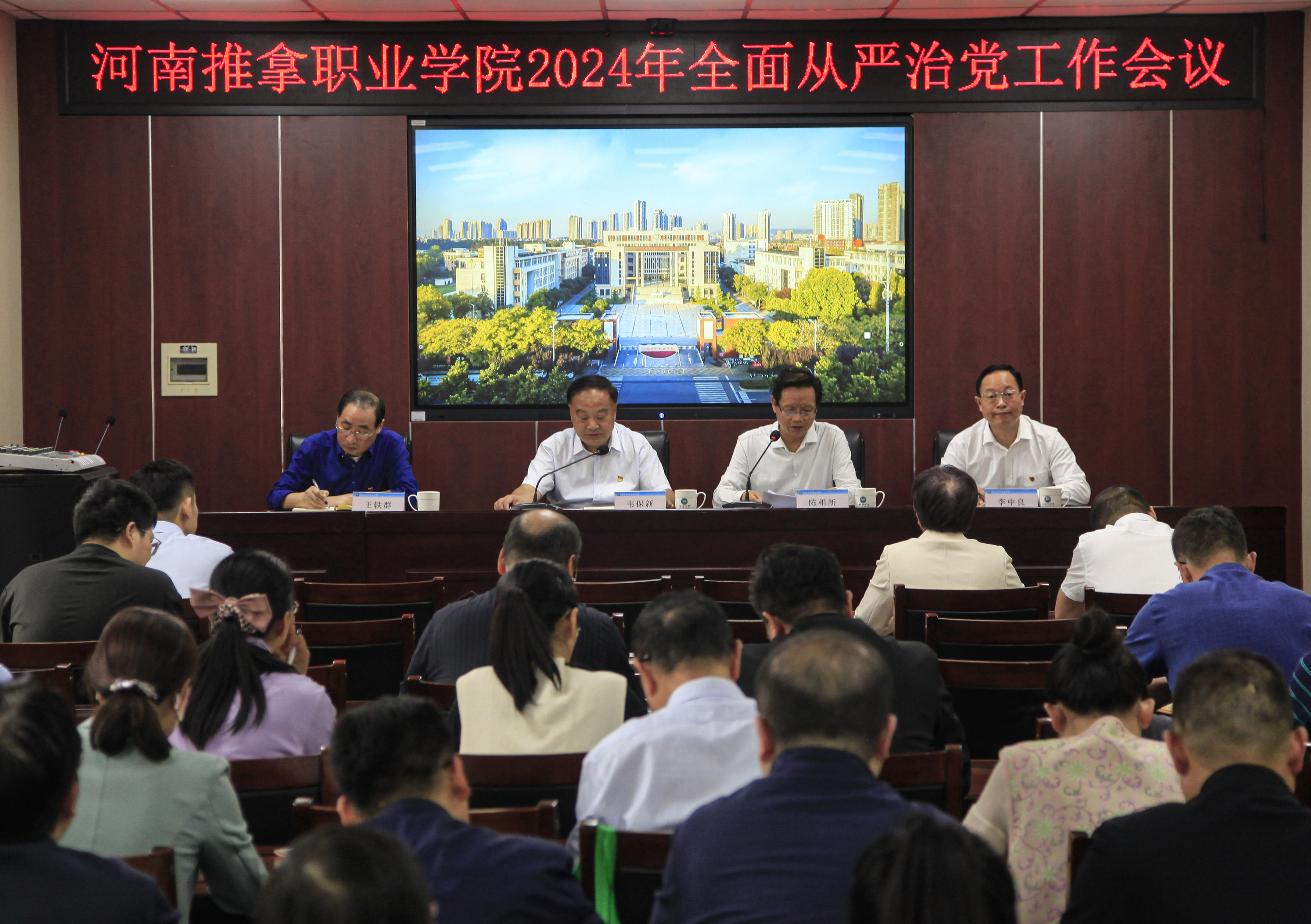 4月24日,学院召开2024年全面从严治党工作会议。党委书记韦保新,院长陈相新,副院长王轶群、李中良出席,全体中层干部,各党总支、直属党支部书记、纪检委员,院纪委工作人员参加。会议由陈相新主持。 陈相新通报了2023年学院全面从严治党工作,...