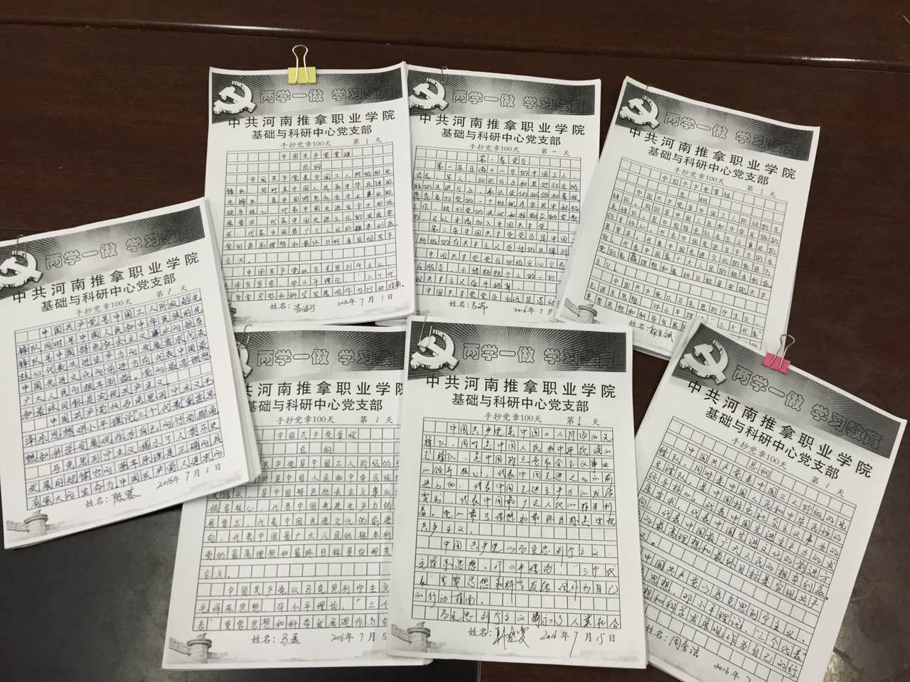 为深入推进党建工作和扎实开展“两学一做”学习教育,自今年7月起,基础与科研中心党支部开展了“手抄党章100天”活动,支部全体党员以手写形式,每天抄写一页大概150字左右的党章原文,用100天时间抄写完全文。 “...
