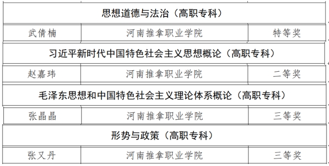 近日,河南省教育厅发布了《关于公布2024年度全省学校思想政治理论课教学技能“大比武”评审结果的通知》,我院教师在本次比赛中取得特等奖1名,二等奖1名,三等奖2名的优异成绩。其中武倩楠老师获得《思想道德与法治》...