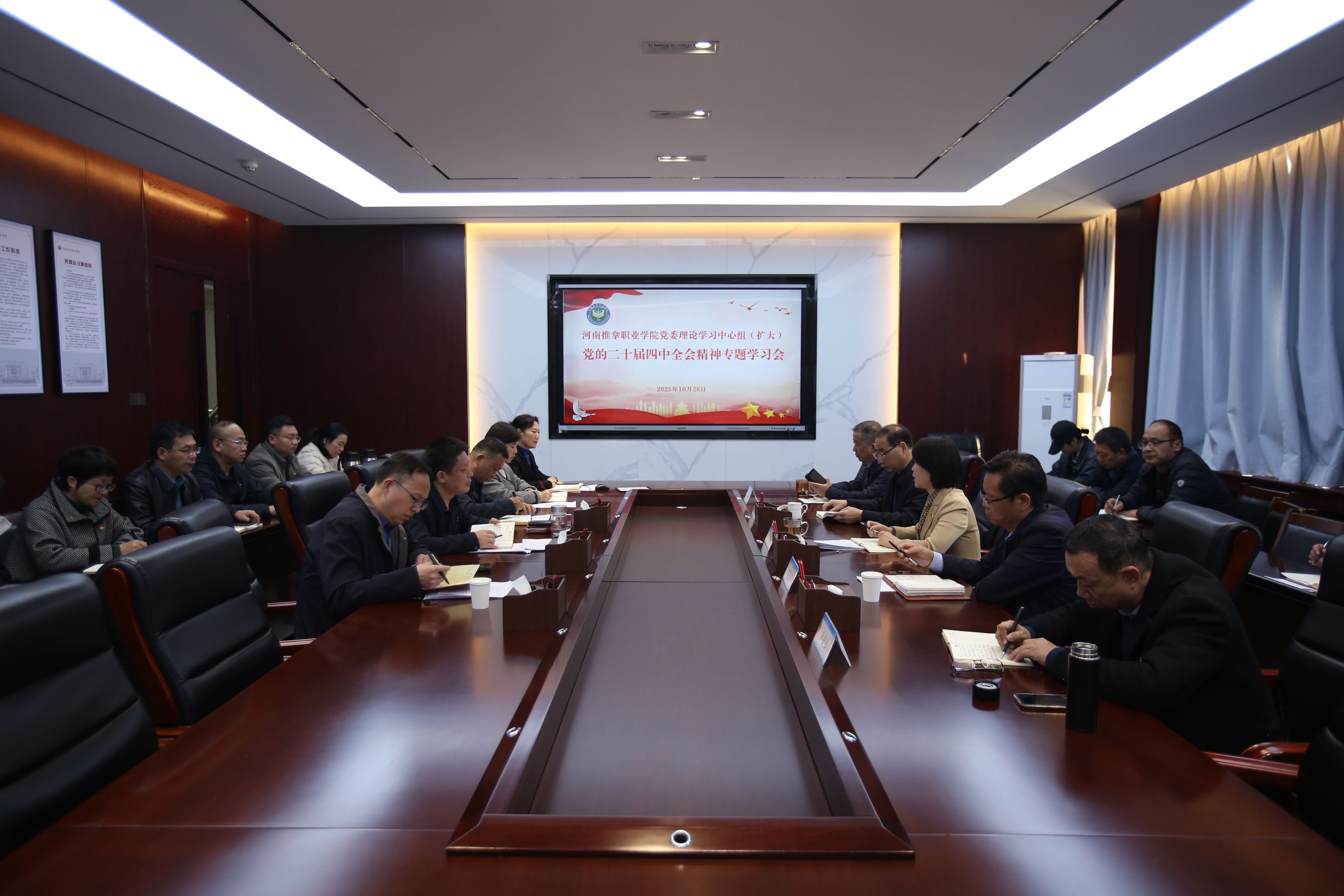 10月28日下午,河南推拿职业学院召开党委理论学习中心组(扩大)会议,传达学习党的二十届四中全会精神,研究部署贯彻落实措施。党委书记付晓丽主持会议,党委理论学习中心组全体成员,各部门、单位负责人参加。会上,传达学习党的二十届四中全会精神,集...
