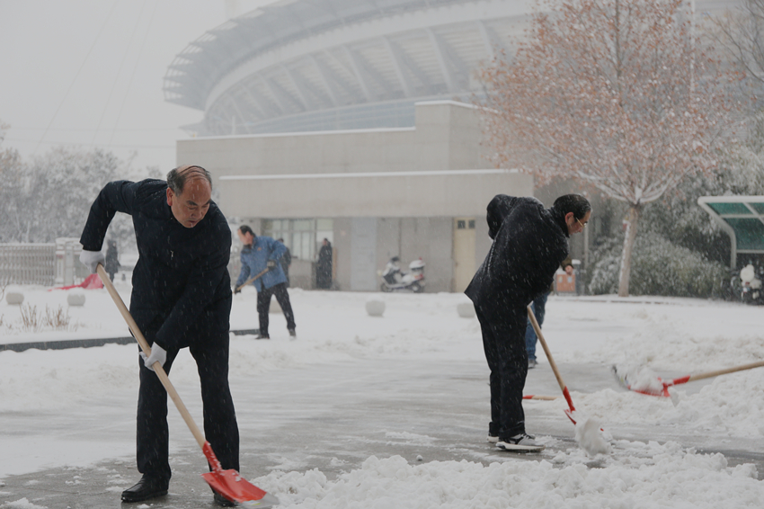 1月3日晚,2018年的第一场大雪悄然而至,一夜过后,美丽的河推校园白雪皑皑,银装素裹,但同时,也给师生的出行带来很大不便。 4日上午,不到八点,院长娄赟、副院长王轶群和工会主席张志强带领学院干部职工迎风冒雪一同为校园清扫积雪。...