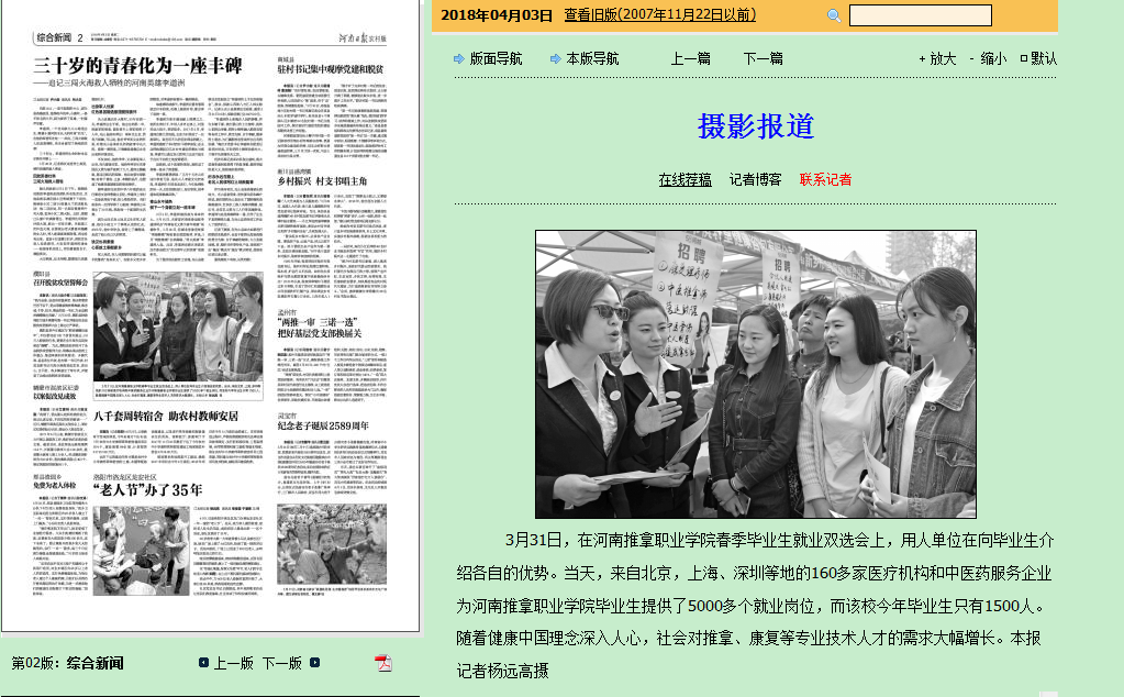 3月31日,我院成功举办2018届毕业生春季就业双选会。双选会吸引了来自全国各省市160余家就业单位参会,提供了5000多个优质就业岗位,人均可挑选岗位超过3个,毕业生持续供不应求。河南日报农村版、中新社、中国网、洛阳电视台、...